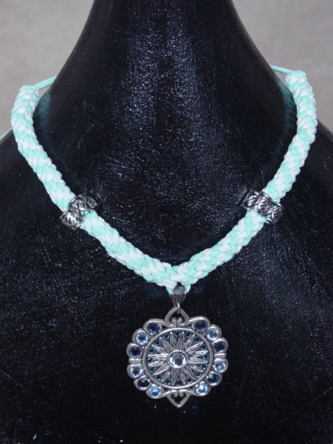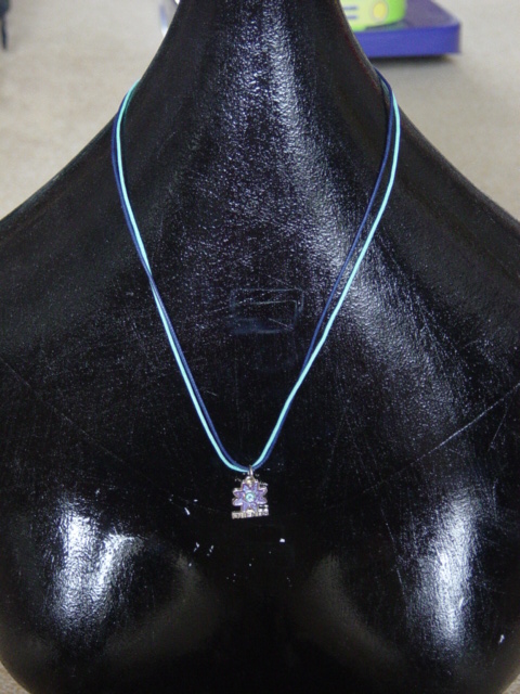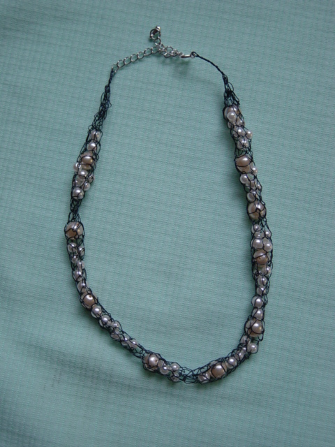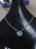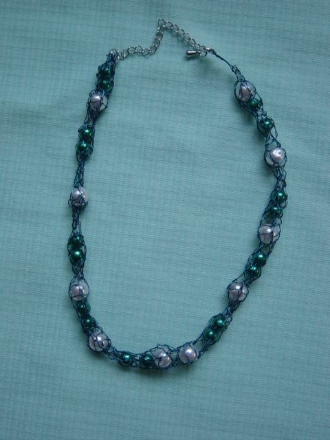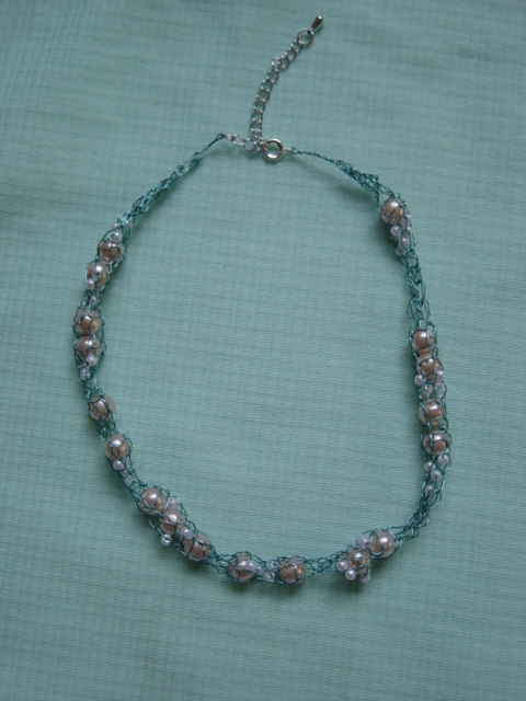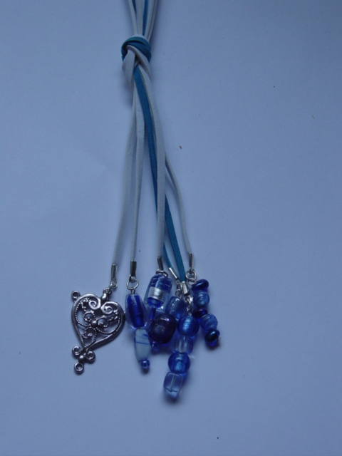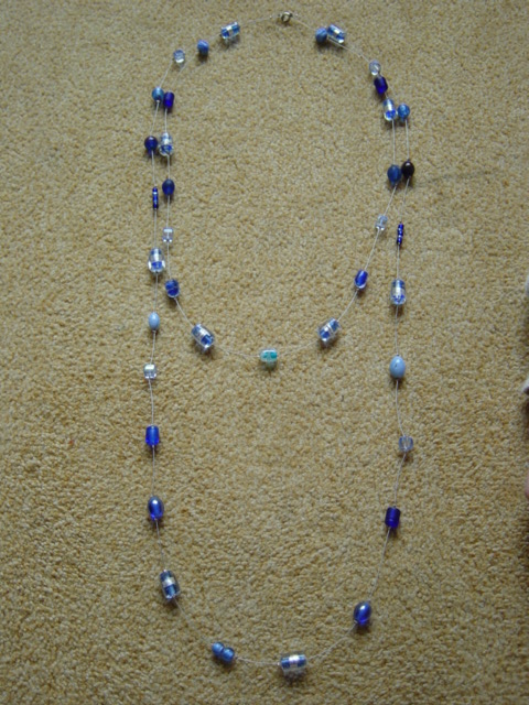 blauwe ketting van geknoopt waskoord met glaskralen. dubbel of in drieen te dragen