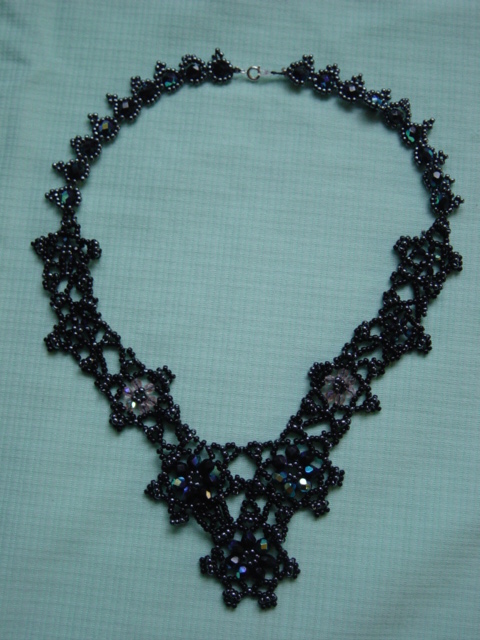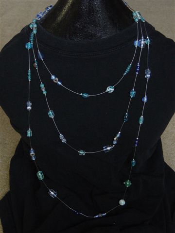3 rijen aculonsraad met blauwe glaskralen, vastgezet met knijpkralen