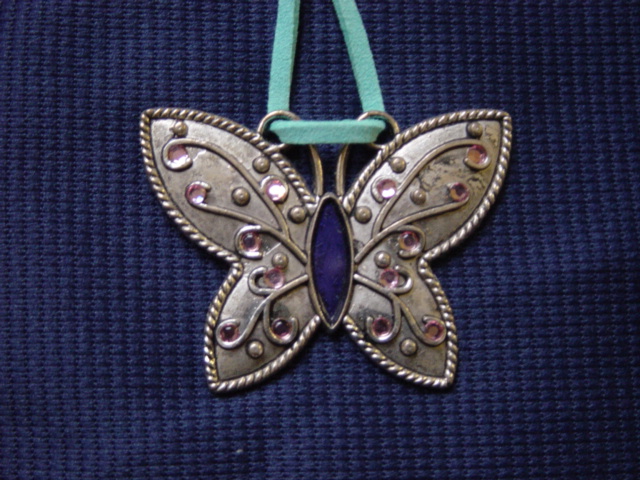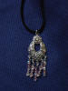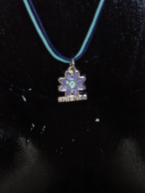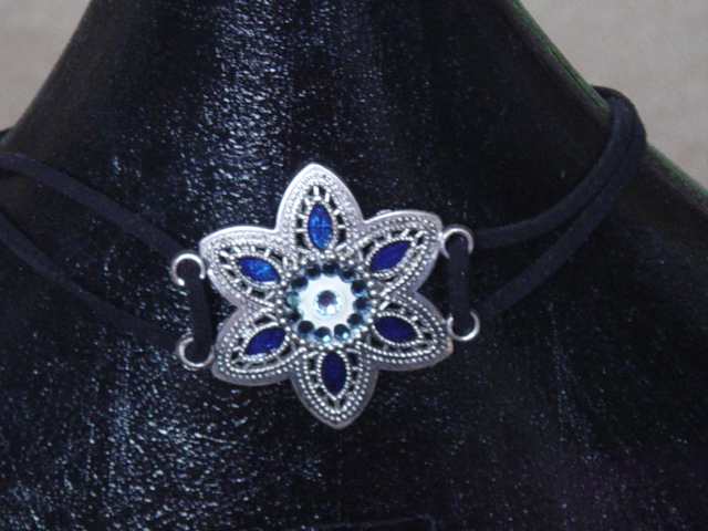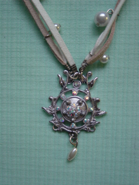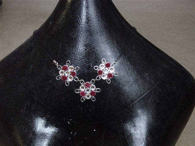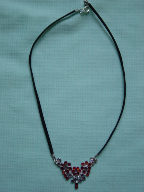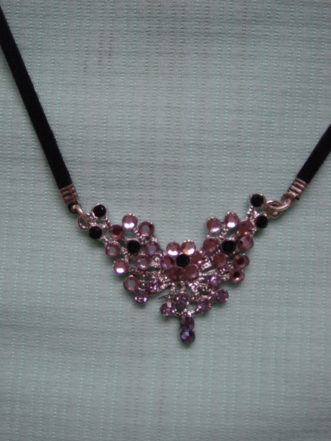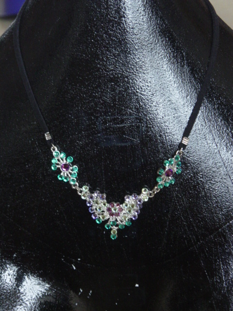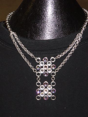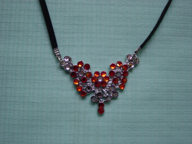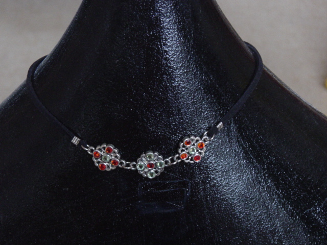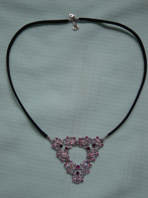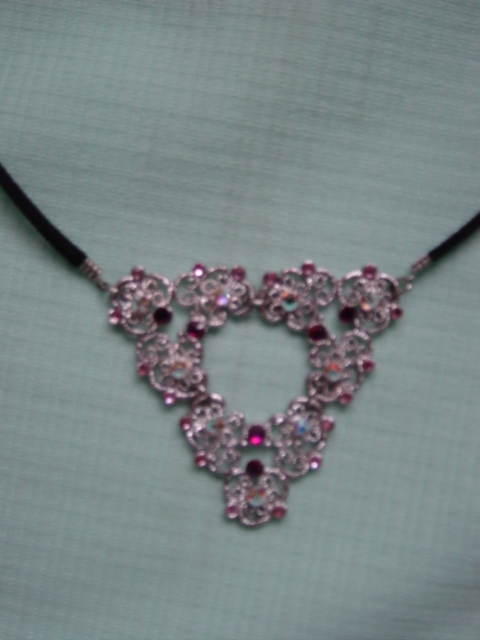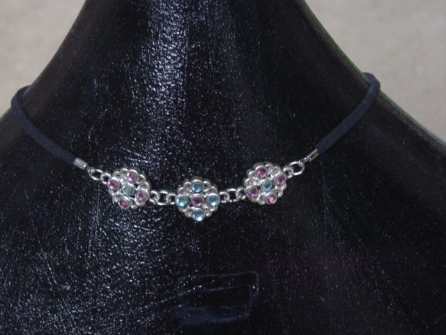Blingketting met swarovskistenen. Twee vierkante ornamenten afgewerkt met koord