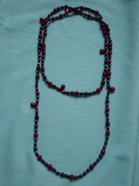 Rode ketting met glaskralen geknoopt aan waskoord. Heel lang in tweeen of drieen te dragen.