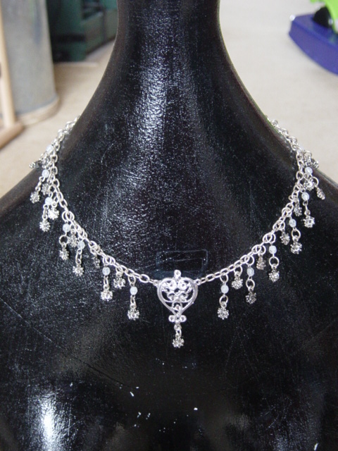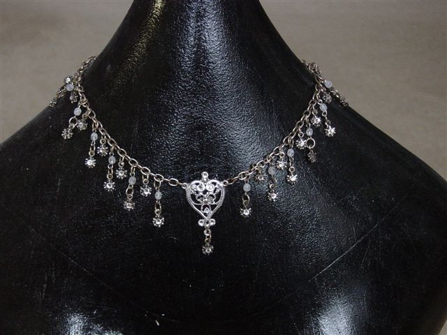 Hartvorm aan jasseronketting met veel hangertjes, aan elk hangertje zit een swarovski steentje