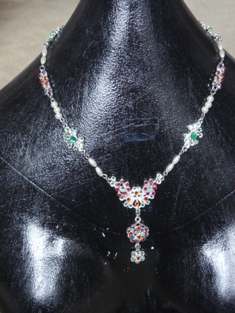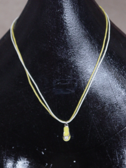 Lange ketting, 4 rijen kraaltjes en glaskralen, afgewerkt met Geknoopte ketting, gele draad met rode glaskralen.