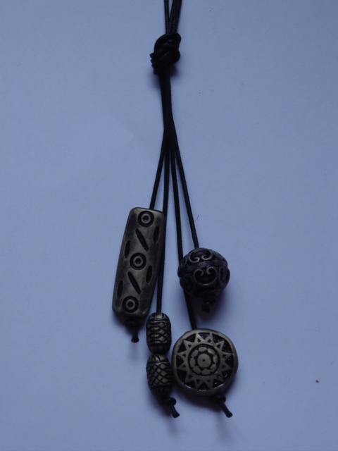 Lange ketting met 4 rijen kraaltjes en glaskralen, afgewerkt met veters