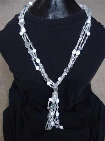 Lange ketting met 8 rijen kraaltjes en glaskralen, ook afgewerkt met veters
